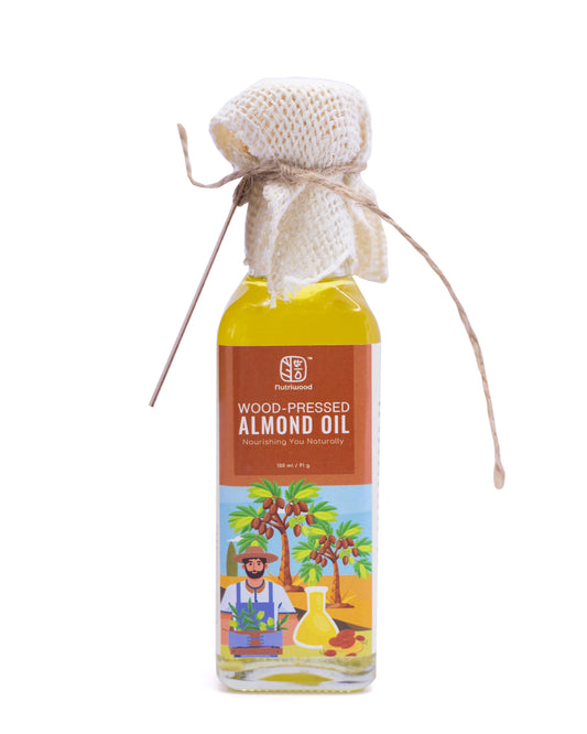 Nutriwood Wood Pressed Almond Oil | Pure Cold Pressed Oil | Pure, Natural |Traditional Wood Pressed | Kolhu/Kacchi Ghani/Chekku |Fights Split Ends & Strengthens Hair | Enriched With Vitamin E | Mineral Oil Free | 100 mL